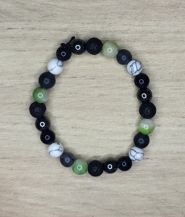 Création en perles. Perles de 8mm. Différentes perles composent ce bracelet : turquoises, pierres volcaniques, jade, hématite, pierre de sable bleu ainsi que de l'agathe